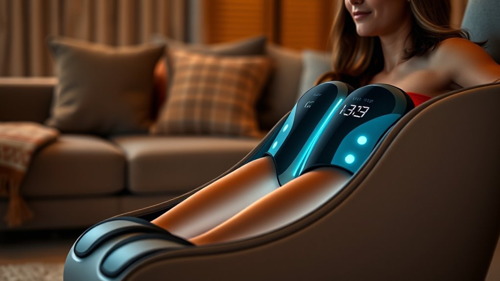 Adjusting intensity and mode settings lets me tailor my calf massage to match my comfort level and specific needs. With multiple intensity levels, I can choose gentle pressure for relaxation or vigorous massage for deeper relief, depending on what my legs require. A variety of massage modes—such as kneading, pressing, or rhythmic compression—allow me to target different issues like soreness, circulation, or fatigue. The ability to switch modes easily means I can customize each session for maximum benefit. Some massagers even offer programmable modes, so I can set routines tailored for recovery or relaxation. Separately controlling intensity and modes provides the flexibility to craft a personalized massage experience that effectively addresses my leg pain or circulation concerns.