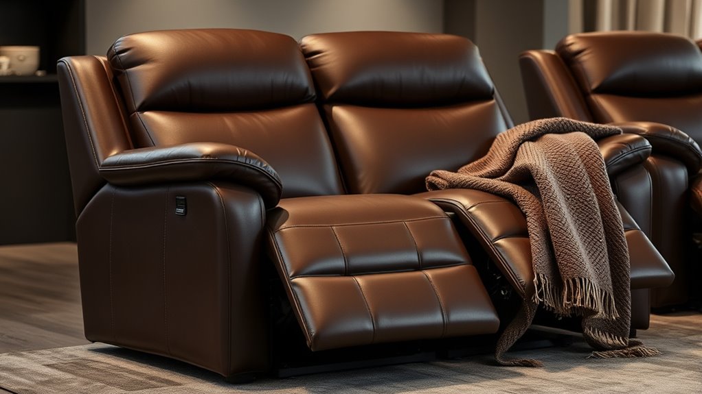 To get the best value on an Irest power recliner, I compare prices across different online and brick-and-mortar stores to guarantee I’m not overpaying. It’s also essential to check the warranty period, which typically ranges from 1 to 3 years, so I know how long repairs or replacements are covered. I make sure the warranty covers both parts and labor, not just specific components like motors or electronic controls, to avoid unexpected costs. I review the warranty terms for any conditions or limitations that might affect my ability to claim repairs. Additionally, I consider the availability of customer support and service options, because having reliable help is vital if I need assistance with warranty claims or product issues down the road.