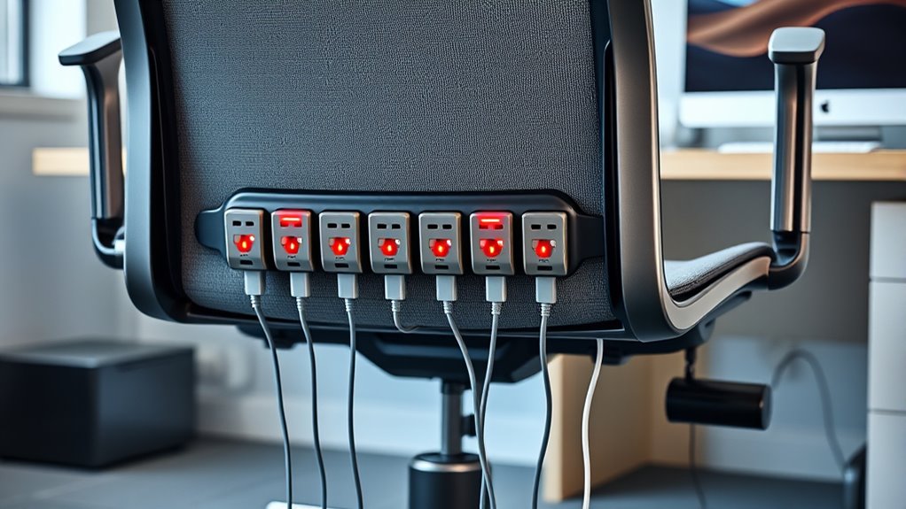 Have you considered how important USB charging options are when selecting an Irest surge protector for your chair? I find that multiple USB ports with a combined output of at least 4.8A guarantee efficient device charging. Look for ports with smart charging technology, which detects and delivers the best power for each device, saving time and preventing damage. It’s also beneficial if the surge protector offers both Type-A and Type-C ports, accommodating a variety of gadgets like smartphones, tablets, and e-readers. Each port should be rated for 5V/2.4A, with some providing higher outputs for fast charging needs. This versatility assures your devices stay powered up and ready to go, making your workspace more functional and clutter-free.