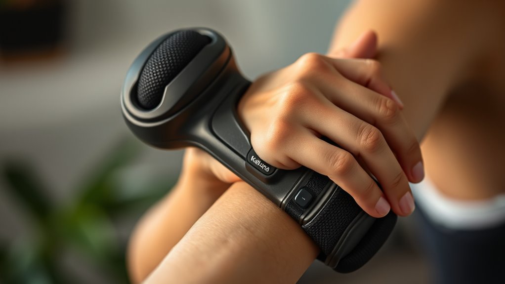 Adjustable intensity levels are essential because they let you tailor the massage strength to your comfort and needs. With multiple options, you can easily switch between gentle and deep tissue pressure, ensuring a personalized experience. Devices offering 3 to 10 intensity settings give you precise control, so you can find the perfect balance without risking discomfort or overstimulation. Some massagers even feature pressure feedback that automatically adjusts intensity based on how much force you apply, making therapy more responsive. Having a range of intensity levels also allows you to target different muscle groups and adapt to your pain tolerance. Whether you want a light massage to relax or a deep one to relieve tension, adjustable intensity levels make your arm massage customizable and effective.