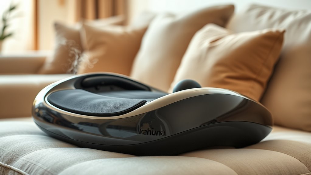 Selecting the right heat function on a Kahuna back massager is essential for maximizing comfort and relief. Different models offer heat temperature levels ranging from 113°F to 127°F, so you can choose the warmth that best suits your needs. Some massagers include adjustable heat intensity, allowing you to customize the warmth without risking discomfort or burns. The heat can operate independently or alongside massage modes, providing targeted deep tissue therapy or soothing warmth based on your preference. Infrared heating options are particularly effective, as they penetrate deeper into muscles, boosting blood flow and speeding recovery—especially helpful for chronic pain or post-workout relaxation. Additionally, safety features like automatic shut-off and overheat protection guarantee you can enjoy extended sessions with peace of mind.