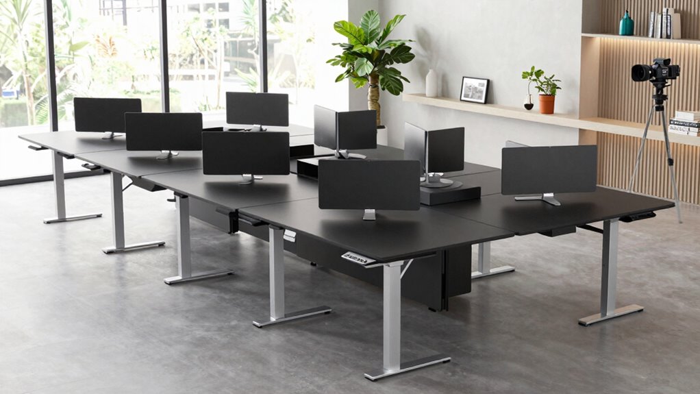 The electric motors in these desks are surprisingly energy-efficient. They use minimal power, typically just a few watts during operation, which means they won’t considerably impact your energy bill. I’ve found that their low energy consumption makes switching between sitting and standing convenient without worrying about high electricity costs. Plus, many models have power-saving modes that further reduce energy use when idle, making them eco-friendly choices for your workspace.