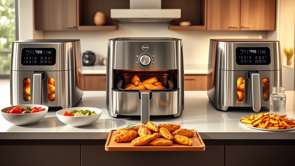 Think of a warranty like a safety net—some models catch you with better coverage. I’ve found that brands like Philips and Cosori offer excellent warranties, often around 2-3 years, plus responsive customer service that’s like chatting with a good neighbor. These companies stand behind their products, making sure you’re not left hanging if something goes wrong. So, if peace of mind matters, these models are worth considering.
