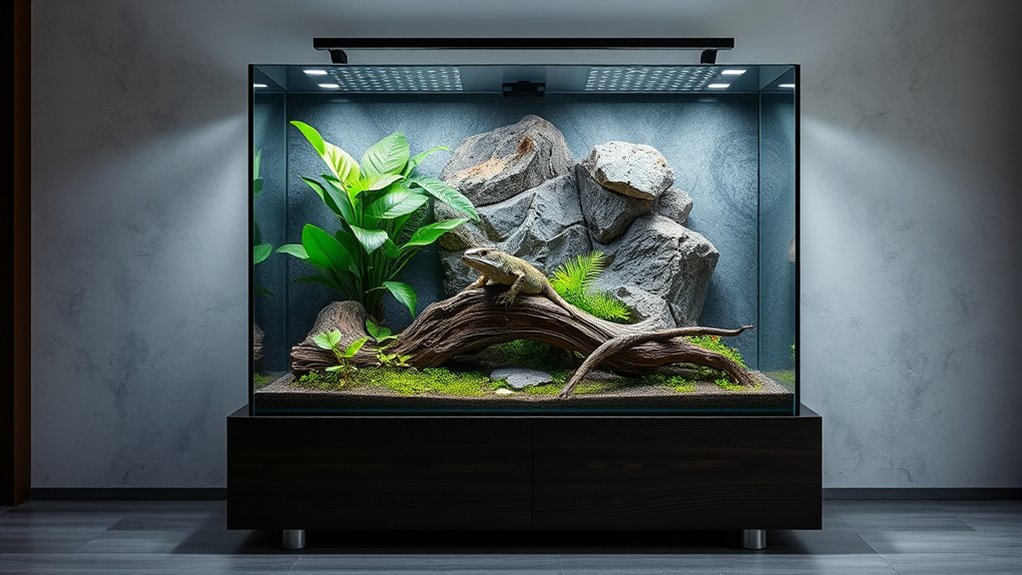 Ensuring proper airflow in a luxury reptile terrarium is essential for maintaining a healthy environment. Good ventilation helps reduce humidity buildup and prevents mold growth, which can pose health risks to your reptiles. It also helps regulate temperature and humidity levels, creating a stable environment that mimics their natural habitat. When choosing a terrarium, look for adjustable vents or screens that give you precise control over airflow. Well-designed airflow promotes the penetration of UVB and infrared light, supporting your reptile’s well-being. However, be cautious of over-ventilation, which can cause temperature fluctuations and stress. Striking the right balance guarantees your reptile enjoys ideal conditions without compromising the overall stability of their habitat.