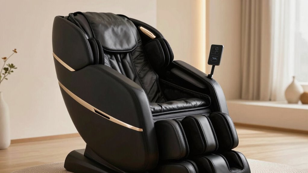 Heat therapy features can considerably enhance the relaxing effects of a massage chair, providing soothing warmth that eases muscle tension and improves circulation. Quick heating capabilities are essential, with ideal temperatures reached within 3 to 10 minutes, ensuring immediate comfort. Adjustable heat levels let me customize the warmth to my preference, whether I want gentle warmth or more intense heat. Safety is critical, so effective systems include overheat protection and automatic shut-off functions, preventing burns during extended use. When integrated well, heat therapy amplifies massage benefits by reducing stiffness and tension, promoting overall relaxation. A chair with reliable heat features ensures a calming experience, making it easier to unwind and de-stress after a long day. Choosing a model with these features can truly elevate your stress relief routine.
