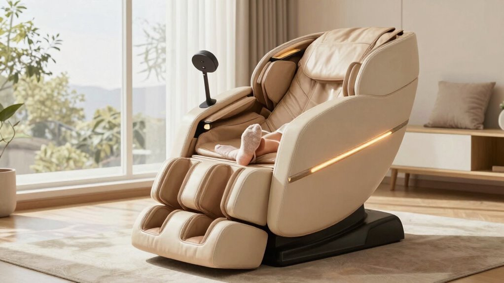 Choosing a massage chair with extensive full-body coverage is essential for effectively reducing swollen feet, as it guarantees all key areas—from your neck to your calves—are addressed. Look for chairs with adjustable coverage that can extend to your hips or thighs, ensuring every swollen area gets targeted. Multi-zone coverage allows you to focus specifically on your calves, feet, and lower back, enhancing therapeutic benefits. A good massage track should run along your entire spine and extend down to your legs, providing holistic relief for interconnected muscle groups. Devices with customizable zones are especially helpful, enabling you to prioritize massage in affected areas like your feet and calves for more effective swelling reduction. This all-encompassing approach maximizes comfort and results.