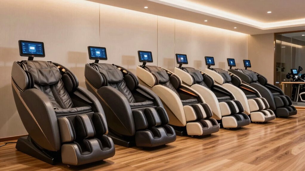 Think of adjustable pressure settings like a tailor-made suit for your muscles. Many models I’ve researched come with customizable settings, allowing you to fine-tune the massage intensity to your needs. This personalized approach guarantees you get just the right relief without overdoing it. Whether you want a gentle unwind or a deep tissue massage, these chairs let you control the pressure, making your recovery sessions safer and more effective.