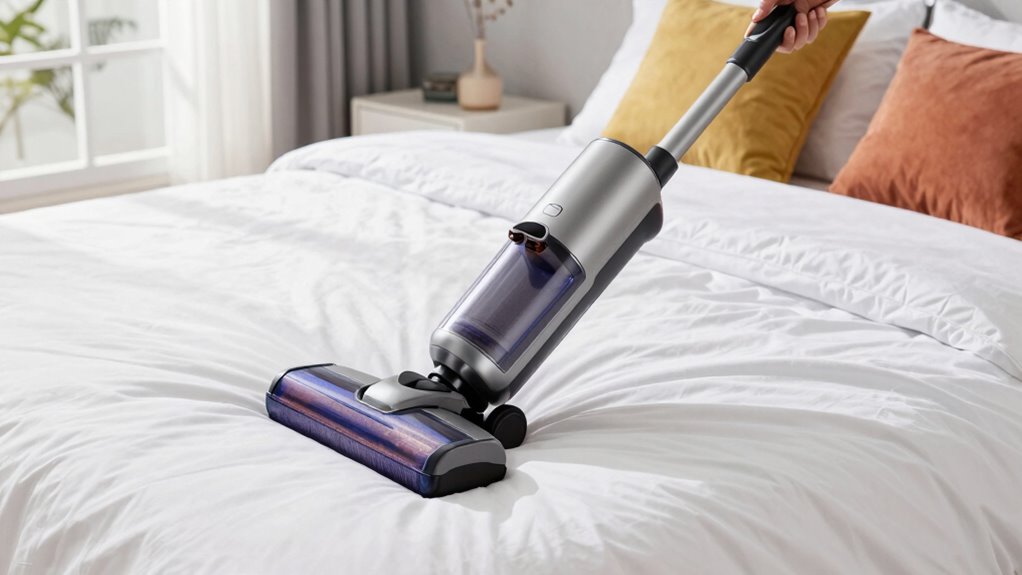 Think of ultrasonic vacuum cleaners as gentle waves washing over your mattress. They are generally safe for all mattress types because they use sound waves rather than harsh brushes or chemicals. I’ve found them effective in removing allergens without damaging delicate surfaces. Just make certain the device is suitable for your specific mattress material, and you’ll enjoy a cleaner, healthier sleep environment without worry.