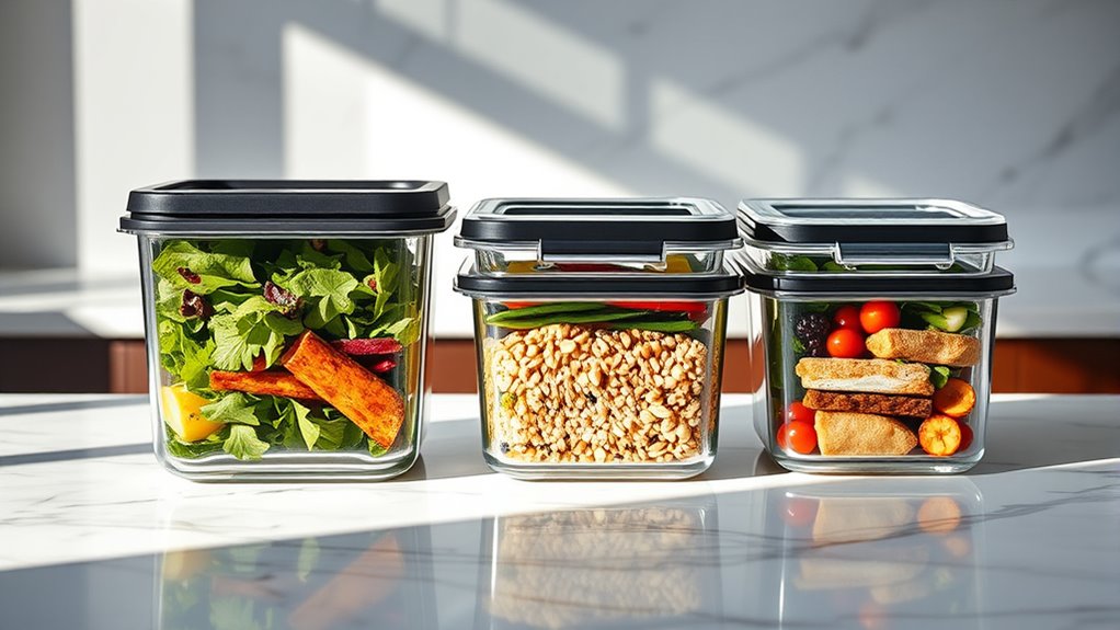 Choosing the right glass meal prep containers balances style and practicality, like finding a perfect outfit that’s both fashionable and comfortable. While some prioritize sleek design, others focus on durability and ease of use. By weighing these factors, you can enjoy fresh, vibrant meals stored in containers that are as reliable as they are attractive. Ultimately, the best choice is one that makes your meal prep effortless and enjoyable, blending aesthetics with everyday functionality.