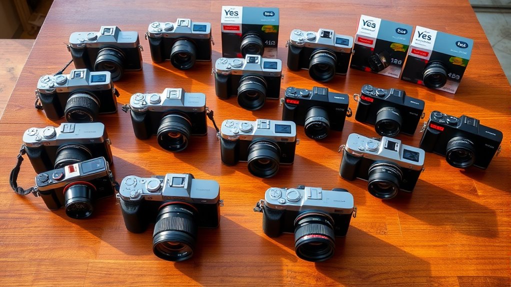 Choosing the right mirrorless camera kit under $1,000 is like finding the perfect brush for your masterpiece—each option offers a unique touch. While some kits feel like a sleek, ready-to-shoot artist’s palette, others resemble a versatile toolkit ready for any scene. Whichever you pick, remember that it’s not just the gear, but your passion that brings your visions to life. After all, every great shot starts with a single click.