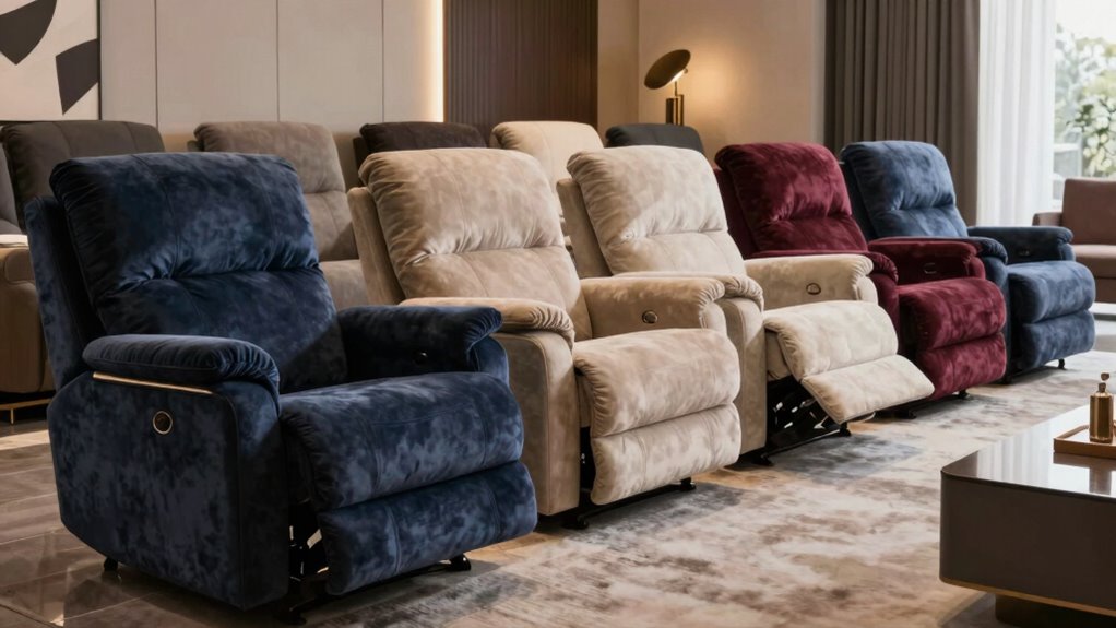 When choosing a recliner that complements your home decor, I focus on color, style, and material. I pick neutral tones like beige or gray for versatility, or bold hues for a statement piece. I also consider the room’s overall style—modern, rustic, or traditional—and match the recliner’s design accordingly. Ultimately, I select materials that blend seamlessly with existing furniture to create a cohesive and inviting space.