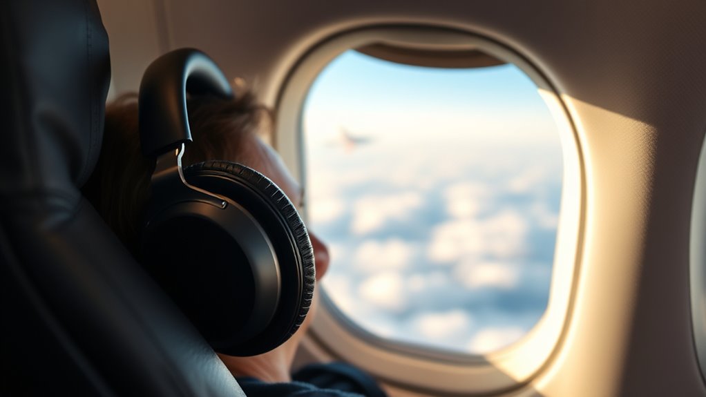 Absolutely, noise-canceling headphones are great for sleeping, especially if you’re in a noisy environment. I love slipping them on and feeling the world fade away, replaced by a cozy silence or calming music. They block out engine roars and chatter, helping me drift off peacefully. Just guarantee they’re comfortable and not too tight. I find they make travel naps much more restful and enjoyable.