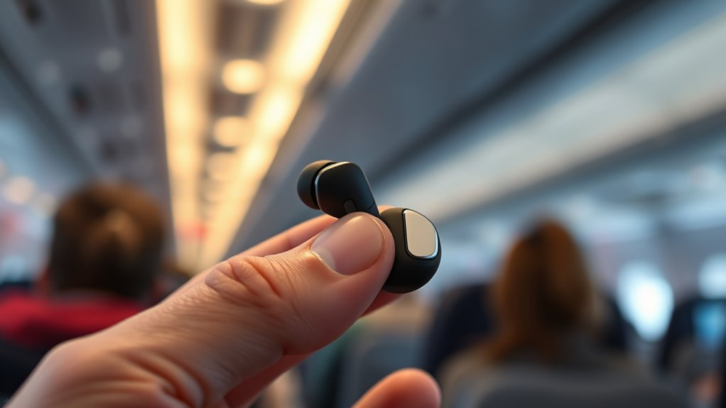 Choosing earbuds with strong noise cancellation is essential for a more comfortable flight experience, especially since the level of noise reduction varies widely among models. Effective earbuds can block out at least 20-30 dB, substantially reducing ambient sounds like engine noise. They use microphones to detect external noise and generate anti-noise signals, boosting cancellation. The effectiveness often depends on the noise’s frequency; high-frequency sounds like engine whine are easier to cancel than low-frequency rumbles. Some models offer adaptive or adjustable modes, letting you customize noise reduction based on your environment. Additionally, a secure fit around the ear or ear canal improves passive and active noise reduction. When choosing, consider these factors to guarantee your earbuds deliver maximum noise cancellation for flights.