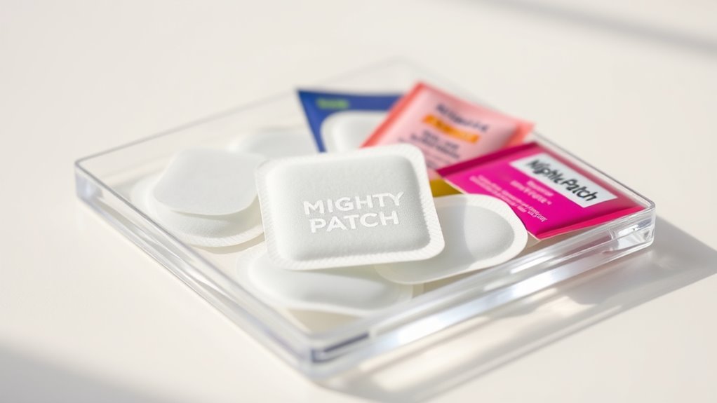 When deciding between day and night pimple patches, it’s important to contemplate how your skin and daily routine influence their effectiveness. Day patches are usually thinner and more discreet, blending seamlessly with your skin so you can wear them confidently under makeup or while out. They’re designed to protect blemishes from irritation and prevent further breakouts. Night patches tend to be slightly larger with stronger adhesive, making them ideal for covering bigger spots while you sleep. They often contain ingredients like hydrocolloid to absorb impurities and promote healing. Your choice depends on your skin’s needs and how active your day is. If you want something barely noticeable during the day, go for a transparent, ultra-thin patch. For more intensive treatment overnight, a larger, more absorbent patch is best.