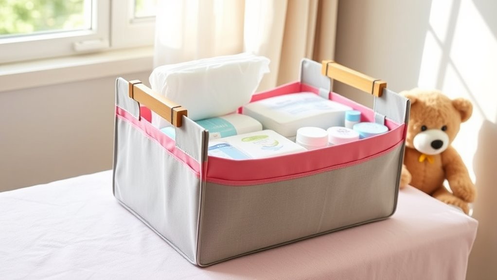 Portability is a crucial factor when picking a diaper caddy, especially if I plan to carry it around frequently. I look for sturdy, long handles made of durable materials like felt or reinforced fabric that feel comfortable and can withstand daily use. A lightweight design, ideally under 2 pounds, makes it easier to carry without feeling weighed down. Foldable or collapsible elements are a plus for compact storage and travel convenience. Multiple compartments or external pockets help me organize essentials and access them quickly on the go. Additionally, reinforced, non-slip grips or handles provide stability and prevent slipping during transport. These features ensure I can easily move the caddy wherever I need, keeping baby essentials within reach without hassle.
