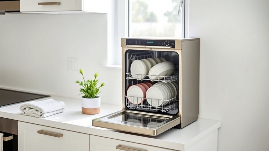 Since space is at a premium in small apartments, I focus on dishwashers that are compact and lightweight enough to move easily. A portable design with built-in water tanks or minimal hookup requirements makes setup quick and stress-free. I look for models with wheels or handles, so repositioning within tight spaces isn’t a chore. Dual water supply options, like tank and faucet connections, give me flexibility in placement. Foldable or adjustable racks are a must—they maximize limited space and fit various dish sizes. These features not only enhance portability but also guarantee the dishwasher can be stored conveniently when not in use. Ultimately, choosing a lightweight, versatile unit helps me keep my kitchen organized and functional without sacrificing space or convenience.