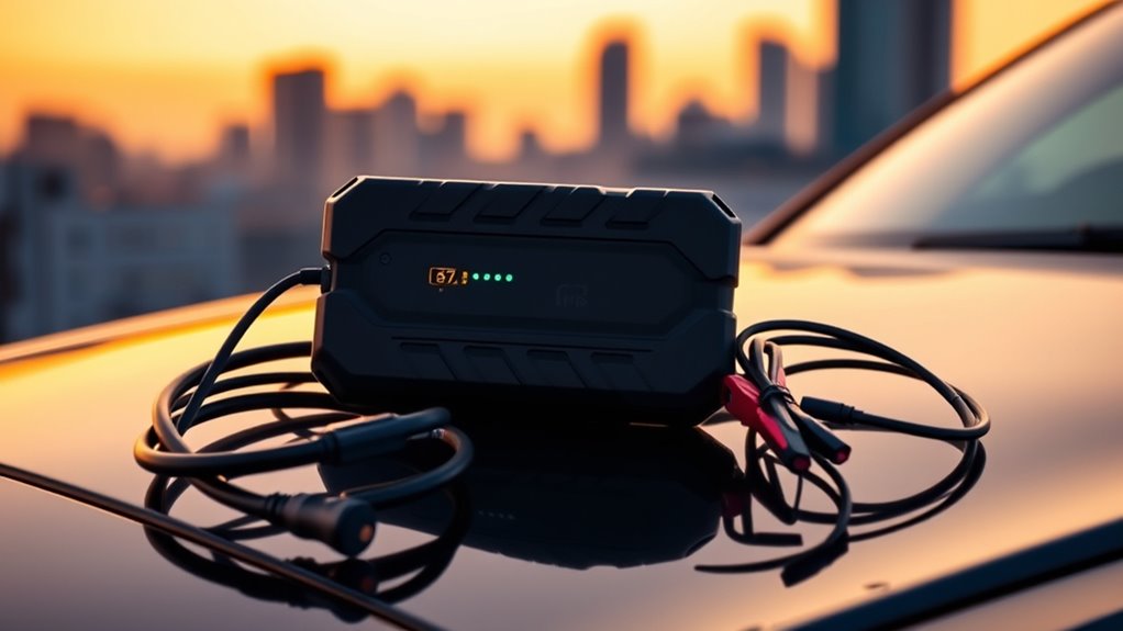 When choosing a portable jump starter, size and weight are key factors that affect how easy it is to carry and store. Most units range from about 4 to 8 inches long, making them compact enough to fit in glove compartments or backpacks. Lightweight models under 2 pounds are perfect for frequent use and won’t add bulk to your gear. Heavier units often provide higher power but can be less convenient to handle. The size of a jump starter usually matches its peak current capacity; smaller ones are ideal for smaller vehicles, while larger units can jump bigger engines. Even multi-function devices with air compressors or power banks remain portable if designed efficiently. Considering dimensions and weight guarantees your jump starter fits comfortably in your vehicle or emergency kit.