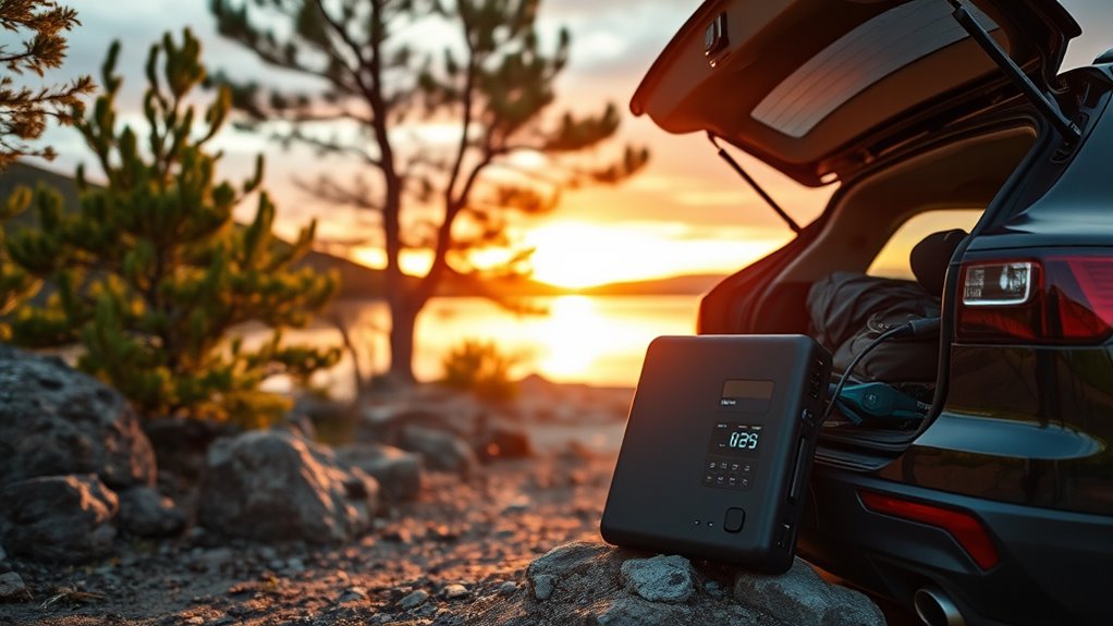 Choosing a portable power station that matches your device needs is vital for a smooth car camping experience. You’ll want multiple output ports—AC, USB, and DC—to power everything from lights and small appliances to chargers. Make sure the station can handle the wattage and surge requirements of your gadgets, like laptops (30-100W) and mini fridges (under 300W). Compatibility with standards like USB-C PD and Quick Charge guarantees fast, efficient charging for smartphones, tablets, and laptops. A built-in inverter providing pure sine wave power is essential for sensitive electronics, preventing potential damage. Also, consider recharging options such as solar panel compatibility, so you can keep your power supply off-grid without relying solely on wall or car outlets. Proper device compatibility ensures seamless power for all your camping gear.
