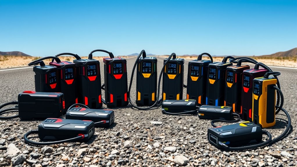 Choosing a portable 12V tire inflator requires guaranteeing it’s compatible with your vehicle’s power source. Most inflators connect to a 12V cigarette lighter socket, so I check that the device fits your outlet. It’s also important to verify the inflator’s power requirements match your vehicle’s electrical system, typically 10-15 amps at 12V DC. Some models support dual power options, like both 12V DC and AC, offering more versatility. I pay attention to the length of the power cord to ensure it can reach all tires comfortably without straining the socket or cord. Additionally, I look for built-in safety features such as overheat and overload protection to prevent damage during use. Compatibility ensures safe, efficient operation whenever I need to inflate a tire on the go.