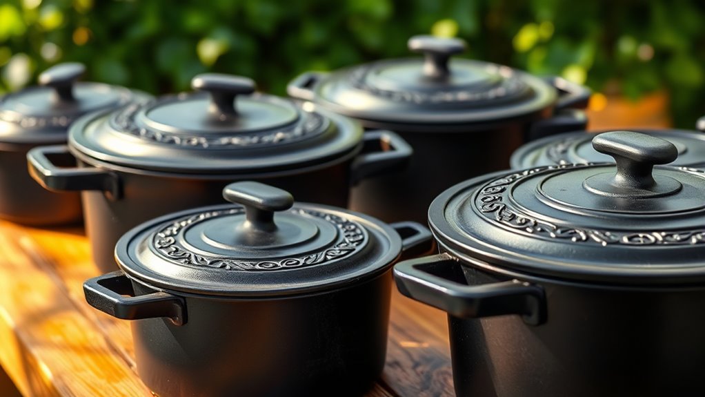 Premium cast iron Dutch ovens excel at maintaining consistent heat, which is crucial for achieving perfect results in a variety of dishes. Their thick walls and dense construction ensure even heat distribution, reducing hot spots and preventing uneven cooking. This means you can simmer, braise, or bake with confidence, knowing your food will cook uniformly. A well-designed Dutch oven also features a tight-fitting lid that traps moisture and heat, enhancing flavors and tenderizing ingredients. The thermal mass of cast iron allows for slow, even heating, making it ideal for long, gentle cooking processes. Plus, excellent heat retention improves energy efficiency and gives you better control over your cooking, helping you achieve consistent, delicious results every time.