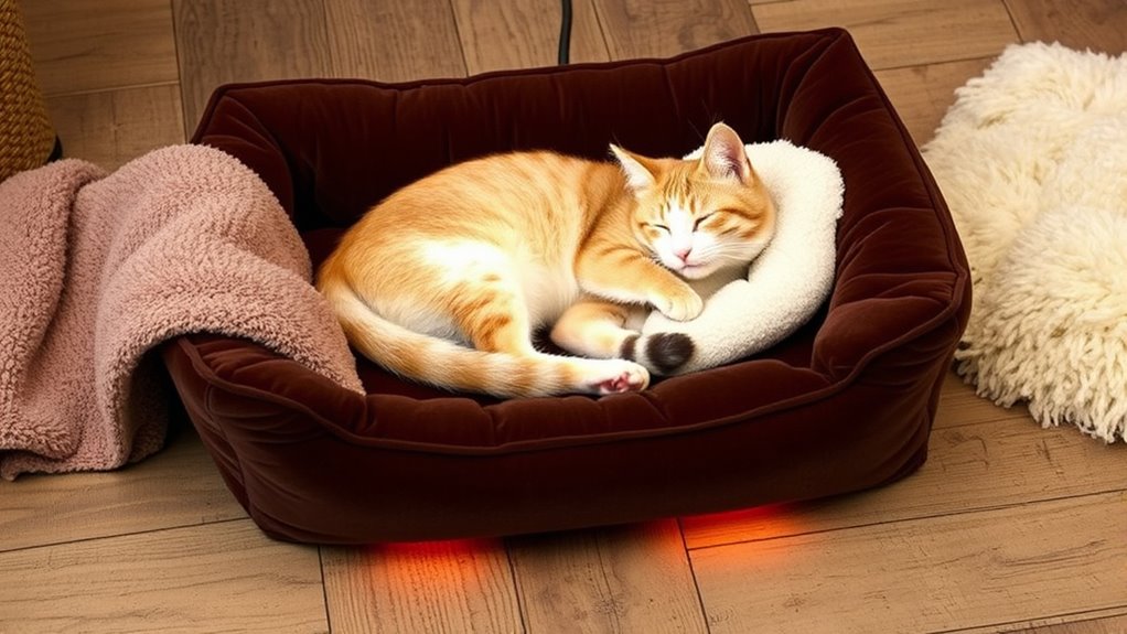 Heated beds can definitely help pets with joint or arthritis issues by providing soothing warmth that eases stiffness and discomfort. I’ve seen how my pet relaxes more and moves easier after using a heated bed. The gentle heat increases blood flow, reducing inflammation and pain. Just make sure to select a bed with adjustable temperature settings and monitor your pet to make certain they stay comfortable and safe.