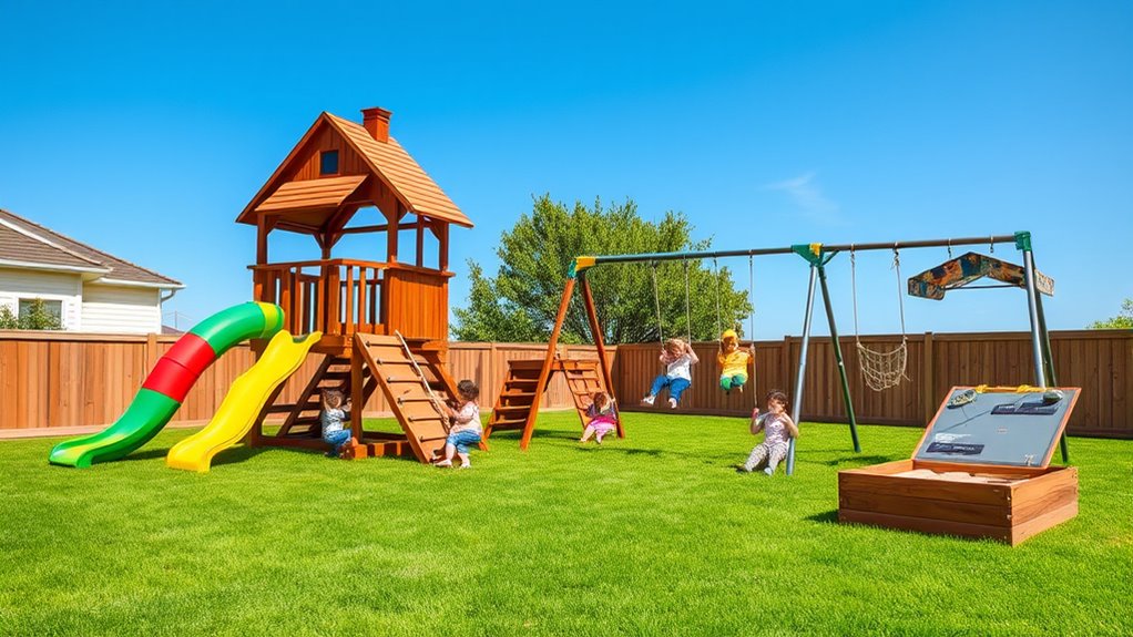 You’ll want a spacious yard of at least 15 by 20 feet for installation and safe play. Imagine a vibrant playground nestled in your backyard, with enough room for kids to run, slide, and swing freely without feeling cramped. Clear space guarantees safe movement and easy maintenance. I recommend measuring carefully and leaving extra room around the equipment for a secure, enjoyable outdoor experience for your little explorers.