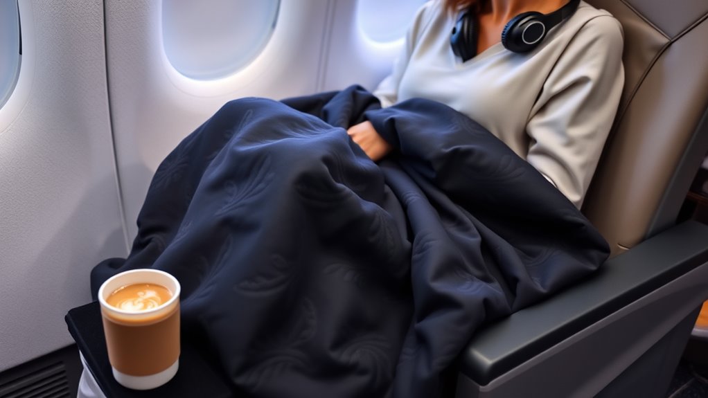 A travel blanket’s size directly impacts how well it keeps you comfortable during long flights. A larger blanket, around 70 x 48 inches, offers more coverage and better warmth, ensuring you stay cozy throughout the journey. When the blanket extends beyond standard sizes, it fully covers your body, reducing cold spots and discomfort. Versatile coverage is a bonus—many blankets can double as pillows or be used for lounging, making them more practical. Even compact, lightweight options can provide adequate coverage if sized properly, making them easy to carry and store. Proper sizing allows you to wrap around your shoulders or cover your legs completely, adapting to different positions and preferences. Ultimately, choosing the right size guarantees maximum comfort and usability during your long flights.