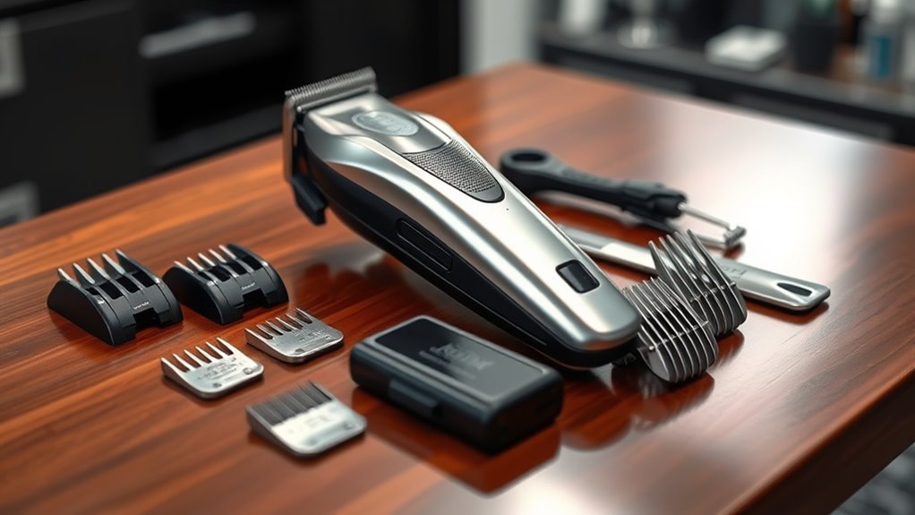 A versatile cordless hair clipper kit should include a variety of attachments to handle different styling needs. Look for multiple guide combs and adjustable blades that suit various hair lengths and styles, giving you flexibility. Make sure the attachments are made from durable, high-quality materials like stainless steel or ceramic for longevity and precise cuts. It’s also helpful if the kit offers specialized heads, such as taper, fade, or beard trimmers, to expand your styling options. Ease of use matters, so check if attachments are easy to swap and lock securely for safe, efficient grooming. Additionally, waterproof or washable attachments make cleaning simple, ensuring your tools stay in top condition and ready for every session.