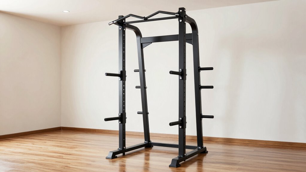 Adjustability features are essential in selecting a pull-up and dip tower because they guarantee the equipment fits my body and workout needs perfectly. I look for towers with multiple height settings, typically from 58 to over 94 inches, so I can customize the fit. The number of adjustable positions varies—some models offer just three, while others have ten or more, allowing for tailored workouts. Easy-to-use mechanisms like push pins, knobs, or twist locks make changing heights quick and tool-free, saving time and effort. Proper adjustability ensures ergonomic alignment during exercises, reducing joint strain and boosting safety. Versatile towers with multiple adjustable components support a broader range of exercises and accommodate users of different ages and sizes effectively.