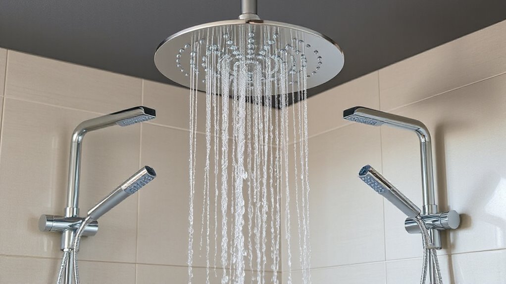 Choosing a rainfall shower system with body sprays means prioritizing water efficiency without sacrificing performance. I look for models with air injection or air-water mixing technology, which can cut water use by up to 30% while maintaining strong pressure. Opting for flow rates around 2.0 to 2.5 GPM helps ensure efficient water use without sacrificing the shower experience. Adjustable water flow controls on each component let me customize water savings during use. Multi-function valves are also a plus, allowing switching between water modes without wasting flow. Ultimately, I verify if the system has certifications like cUPC or meets energy efficiency standards, confirming it adheres to water-saving regulations. These features help me enjoy a luxurious shower while conserving water effectively.