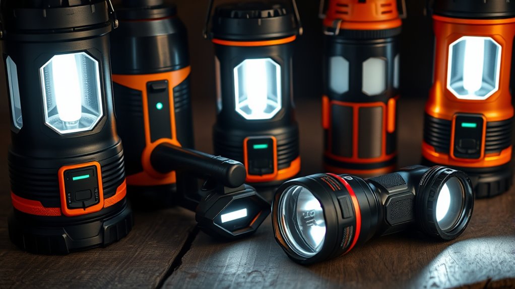 If you’re after the 15 best rechargeable lanterns and flashlights, I’ve checked out top models with powerful brightness, long runtimes, and durable waterproof designs. Many feature multiple modes, adjustable brightness, and built-in power banks for emergencies. They’re lightweight, portable, and great for outdoor adventures or power outages. If you keep exploring, you’ll find details on what makes each one stand out and how to choose the perfect light for your needs.