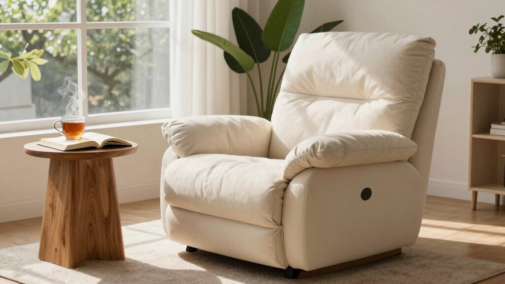 Different materials markedly impact comfort and durability in relaxation chairs. Soft fabrics like microfiber offer plushness, making long reading sessions cozy, but might wear quicker. Leather is durable and ages well, providing a sleek look, yet can be less breathable. Memory foam cushions mold to your body for comfort, while sturdy hardwood frames ensure longevity. I recommend balancing softness with durability based on your daily use and preferences for the best experience.