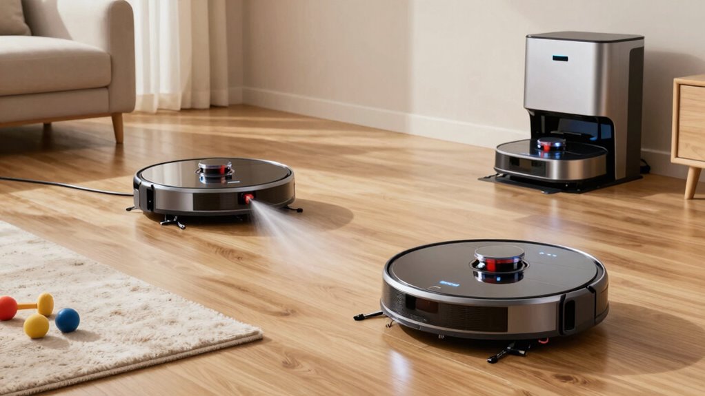 Advanced navigation and mapping features are essential for ensuring your robot vacuum mop covers every corner efficiently and safely. These technologies, like LiDAR, structured light sensors, or SLAM algorithms, help robots create detailed floor plans, enabling precise cleaning routes. Multi-floor mapping allows the robot to remember different layouts, perfect for homes with multiple levels. Obstacle avoidance sensors prevent collisions and falls by detecting walls, furniture, and stairs, ensuring safe operation. Smart mapping systems offer zone cleaning, no-go zones, and targeted spot cleaning, giving you customization options tailored to your home’s needs. These features work together to maximize cleaning coverage, reduce missed spots, and minimize accidents, making your robot more effective and reliable around your living space.