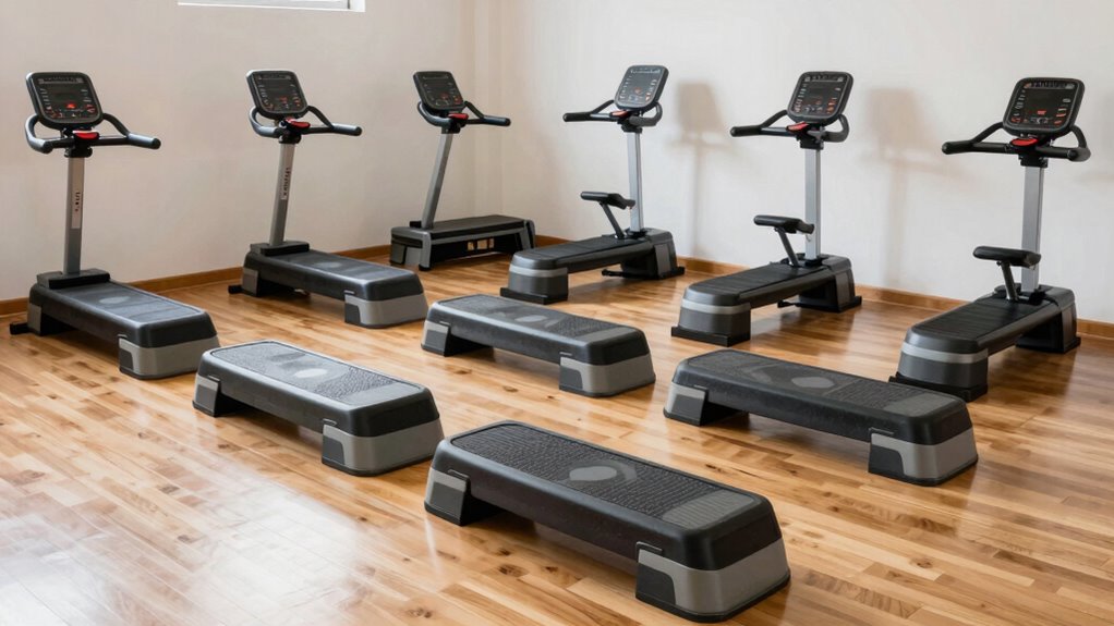 The heavy-duty seated stepper I recommend can safely support up to 300 pounds. I always make certain I adhere to the manufacturer’s weight limit for safety and ideal performance. When choosing a stepper, I look for sturdy construction and clear weight specifications. It is crucial to respect the weight capacity to prevent damage and ensure a safe, effective workout. Remember, exceeding the limit can lead to injury or equipment failure.