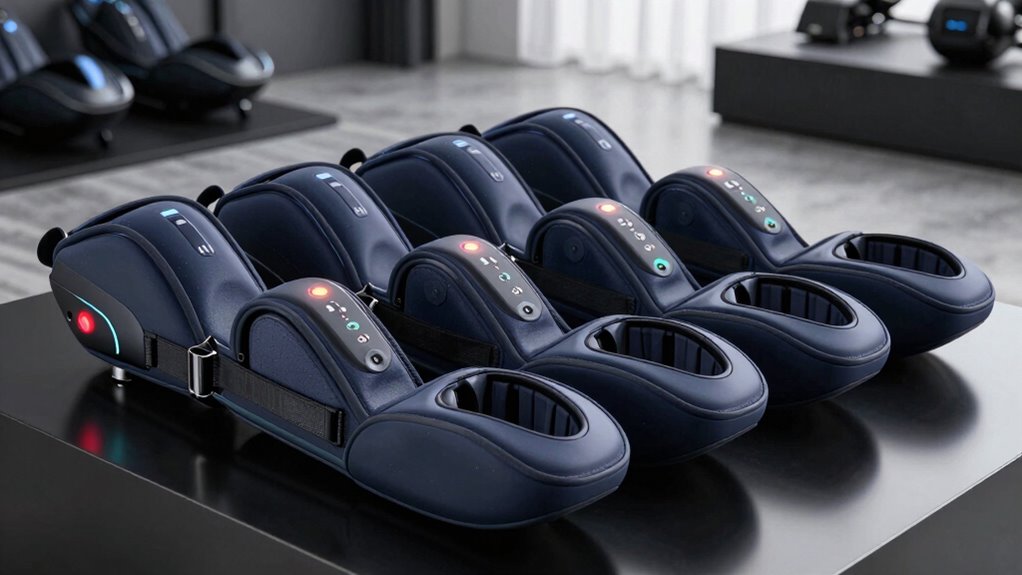 When choosing a sequential compression leg massager, ease of use is vital to guarantee a comfortable and effective experience. An intuitive control interface, like a backlit LCD display or handheld controller, makes navigation simple for users of all ages. Features such as pressure sensors and auto shut-off timers help with adjustments and ensure safety without hassle. Clear instructions and well-labeled buttons allow for quick learning and management of settings. Ergonomic design elements, such as easy-to-wear zippers, Velcro straps, or slip-on sleeves, make donning and removing the device effortless. Additionally, pre-programmed modes or memory functions enable you to quickly resume your preferred settings without reconfiguring each time, making the massage experience seamless and user-friendly.