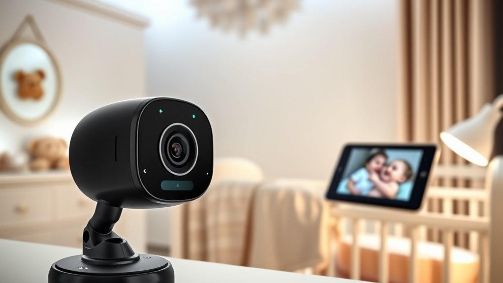 Choosing a smart baby monitor with a high-quality camera guarantees you get clear, detailed images of your little one, making it easier to monitor their safety and comfort. High-resolution options like 1080p or 2K deliver sharp images that reveal facial expressions and sleep positions. Features such as digital zoom and pan-tilt-zoom let you focus on specific areas or get a closer view when needed. Night vision technology, including infrared or low-light color modes, ensures you see your baby clearly even in darkness with color accuracy. Wide-angle lenses, around 120° or 147°, provide broad coverage, reducing blind spots. Additionally, advanced CMOS sensors contribute to true-color, crisp footage during day and night, offering peace of mind through crystal-clear visuals.