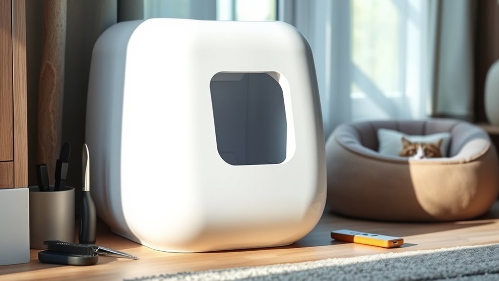 When selecting a smart cat litter box, ease of maintenance is a key factor that can save you time and frustration. I look for models with removable, washable components that make cleaning straightforward. Auto-cleaning features, like timers or sensors, help reduce manual scooping, keeping the litter box fresh with minimal effort. An accessible waste bin that holds several days’ worth of waste means fewer trips to empty it, which is a huge plus. I also choose designs with clear instructions and minimal disassembly requirements, so upkeep isn’t complicated. Finally, I prioritize units with easy-to-clean surfaces and simple filter or liner replacements. These features ensure that maintaining the litter box remains quick and hassle-free, making pet care more convenient overall.