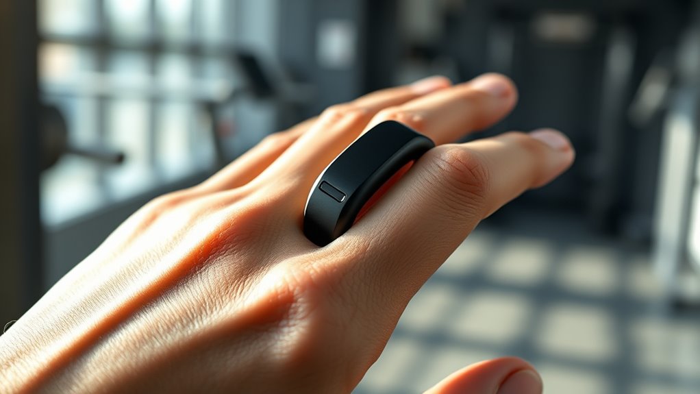 A smart ring’s battery life plays a essential role in guaranteeing uninterrupted fitness tracking and convenience. A longer battery life means I can wear the ring continuously without frequent charges, which is especially helpful during busy days or long trips. Most devices offer 3 to 5 days of use per charge, providing reliable monitoring without constant attention. Some high-end rings even last up to 15 days, reducing the hassle of frequent charging. Additionally, smart charging cases can extend this even further, sometimes allowing over 20 days of use between charges. Battery longevity is critical for those committed to consistent tracking, especially during intense fitness routines. It ensures I stay connected to my health data without interruption, making the ring a seamless part of my daily routine.