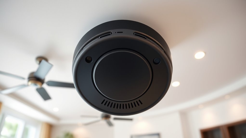Detection accuracy in smart smoke and CO detectors hinges on the quality and sensitivity of their sensors. For smoke, photoelectric sensors detect particles from smoldering fires, while electrochemical sensors are essential for CO detection. Some models use dual sensors that operate independently, offering faster and more reliable alerts for specific hazards. Proper placement is also critical—avoiding vents or cooking areas reduces false alarms and guarantees sensors respond accurately. Regular testing and calibration are necessary to maintain sensor sensitivity and confirm the detector’s reliability during emergencies. Additionally, choosing detectors certified by organizations like UL or Intertek guarantees they meet strict standards for accuracy and dependability. Prioritizing these factors helps guarantee your detectors provide precise, timely alerts, keeping your home safe and protected.
