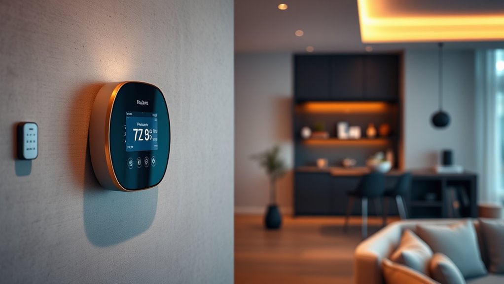 The effectiveness of remote sensors depends heavily on their placement and range within your home. Typically, sensors can reach up to 200 feet indoors, but this varies based on home construction and Wi-Fi strength. Proper placement is key—position sensors in main rooms like bedrooms or living areas to get accurate readings and improve comfort. Avoid placing sensors in direct sunlight, near drafts, or heat sources, as these can skew temperature data. The number of sensors needed depends on your home’s size and layout; multiple sensors help with zoning and energy efficiency. Correct placement is essential for occupancy detection and precise temperature control. Sensors too close to vents or windows can produce false readings, so thoughtful placement makes all the difference.