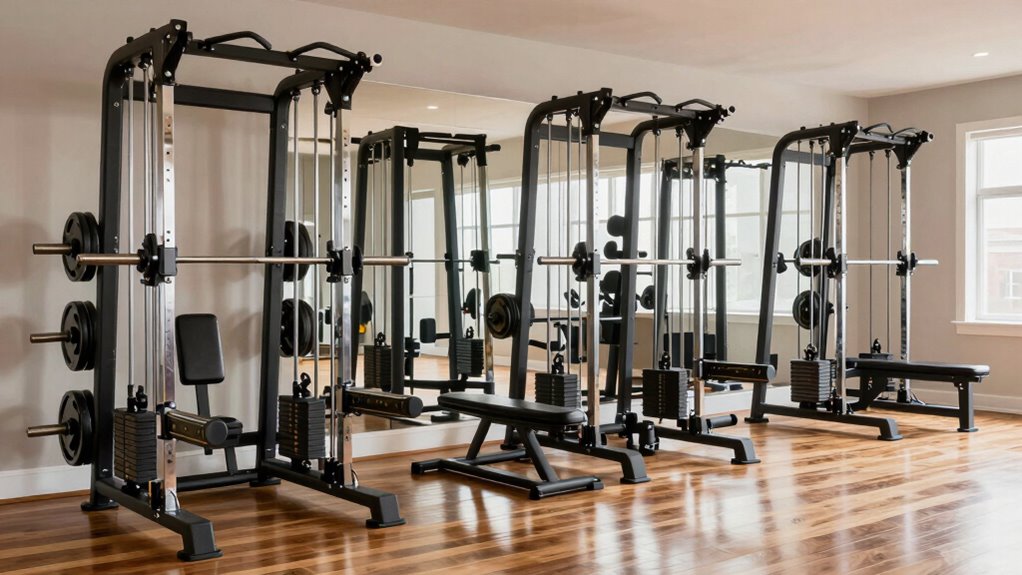 To choose the right Smith machine for your home gym, you need to carefully assess the space available. Measure your workout area to ensure the machine fits comfortably without obstructing movement or other equipment. Pay close attention to the machine’s footprint, including height, length, and width, to confirm it can be safely accommodated. Leave enough clearance around the machine for safe exercise execution and easy access to all workout stations. Also, consider your ceiling height, especially if you plan on doing pull-ups or overhead presses—low ceilings can be a real obstacle. Don’t forget to factor in extra space for storing weights and accessories, as well as for dynamic movements, to create a functional and safe workout environment.