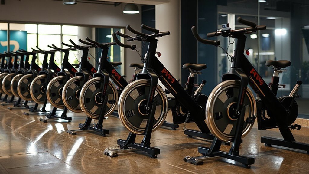 When selecting a spin bike with a heavy flywheel, focusing on build quality and durability is essential to guarantee it withstands rigorous workouts over time. A sturdy frame made from high-grade materials like reinforced steel ensures the bike remains stable and resilient. Quality bearings are necessary for smooth operation and long-term performance, preventing wobbling or loosening. Robust welds and joints provide structural integrity, especially during intense sessions. Heavy-duty components such as the resistance system and pedals must handle high resistance levels without wearing out quickly. Regular maintenance, including lubrication and inspections, is imperative for preserving the bike’s durability. Investing in a well-built model means your spin bike will endure frequent use, maintaining performance and safety for years to come.