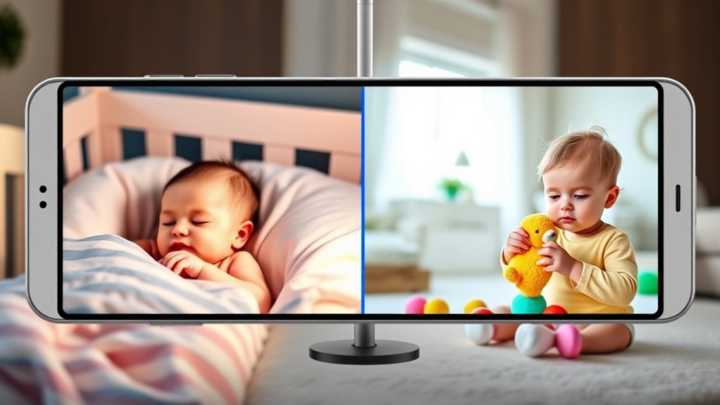 If you’re looking for the best split-screen baby monitors of 2025, I’ve found several options that highlight advanced features like large screens, multiple camera support, remote pan-tilt-zoom control, and secure wireless connections. Many models also offer long battery life, two-way audio, night vision, and environmental sensors—perfect for watching every moment of your little one’s day. Keep looking, and I’ll guide you through the top choices to help you find the perfect fit.