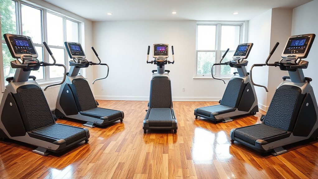 Choosing a stair stepper for home use means considering how much space it will take up in your living area. Many space-saving models feature foldable or compact frames that fit easily into small rooms or apartments. Most are less than 20 inches wide and deep, maximizing space without sacrificing essential workout features. Vertical or low-profile designs help minimize the machine’s footprint, making setup and storage effortless. Some models even include integrated storage or can be stored vertically against a wall when not in use. Opting for a compact stair stepper makes it easier to move and store, which encourages consistent workouts in tight or shared spaces. A space-efficient design guarantees you can enjoy your fitness routine without clutter or sacrificing valuable room.
