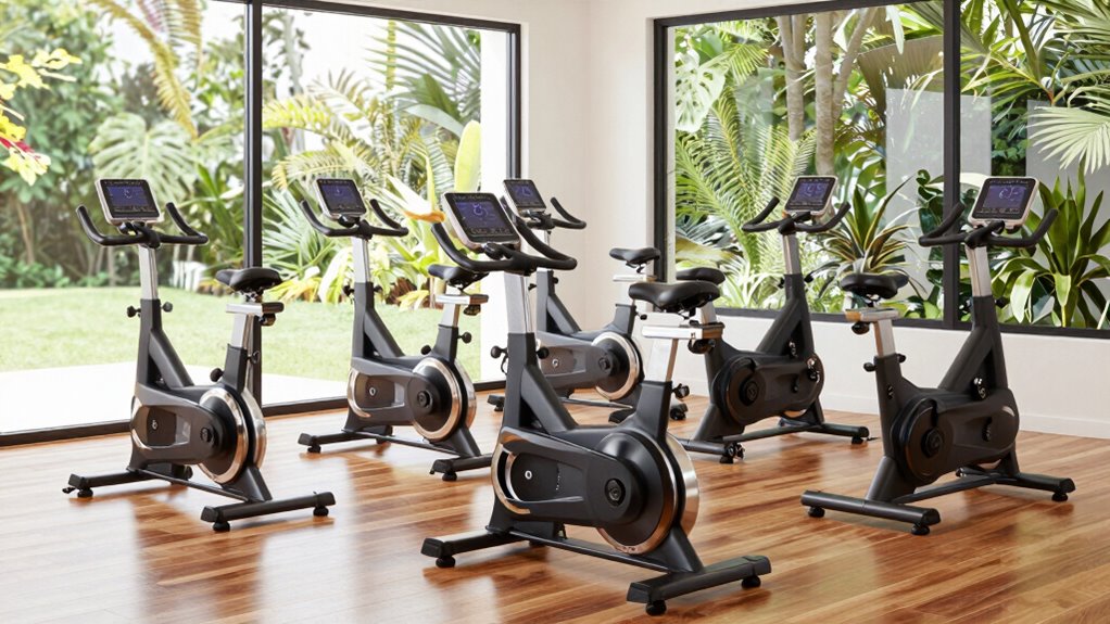 I’ve found that these bikes handle stability really well during intense workouts, even for taller users like me. Their sturdy frames and wide bases prevent wobbling or shifting, giving me confidence to push harder. Adjustable components also help keep balance and control. Overall, I feel secure and steady, which motivates me to train harder without worrying about stability issues. If you’re tall, these bikes are designed to keep you safe and balanced during vigorous sessions.