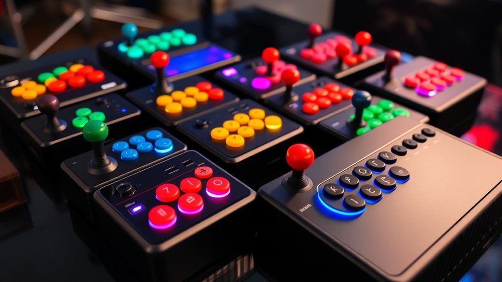 Customization options play a crucial role in tailoring a fight stick to your specific gameplay style and aesthetic preferences. Look for sticks that let you personalize artwork and swap out top panels to match your vibe. Remapping buttons and macro programming are essential for creating strategies unique to your playstyle, so verify the device supports these features. Software-based profile management is also a huge plus, allowing you to switch configurations effortlessly between games. Don’t forget about replaceable components like Sanwa or Hayabusa parts, which make upgrades and maintenance straightforward. Additionally, adjustable control options, such as restrictor plates for 4- or 8-way movement, give you greater precision and flexibility. These customization features help you optimize your setup for competitive play and personal comfort.