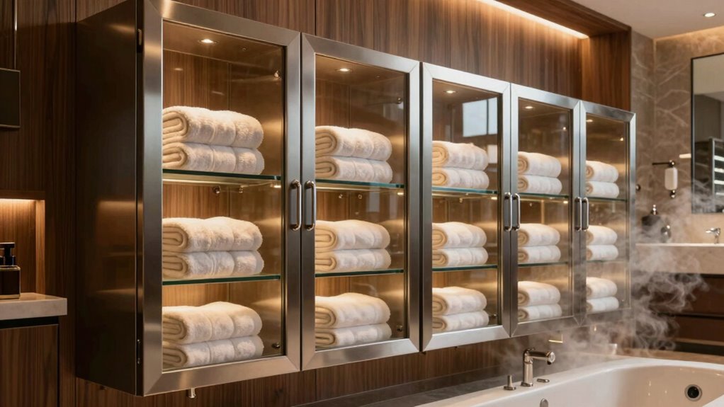 Since humid environments can accelerate wear and corrosion, the material of a towel warmer cabinet is essential for durability. I recommend choosing rust-resistant materials like stainless steel or high-grade aluminum, which can withstand moisture and prevent rust. These durable metals maintain their structural integrity over time and resist corrosion, ensuring the cabinet lasts longer. The interior lining, often made of stainless steel or coated metals, adds an extra layer of protection against water damage. High-quality, heat-resistant plastics can also be a good option for exteriors, offering lightweight durability and resistance to heat. Ultimately, the material impacts the cabinet’s longevity, maintenance needs, and safety. Investing in quality materials means fewer repairs and a more reliable addition to your spa environment.