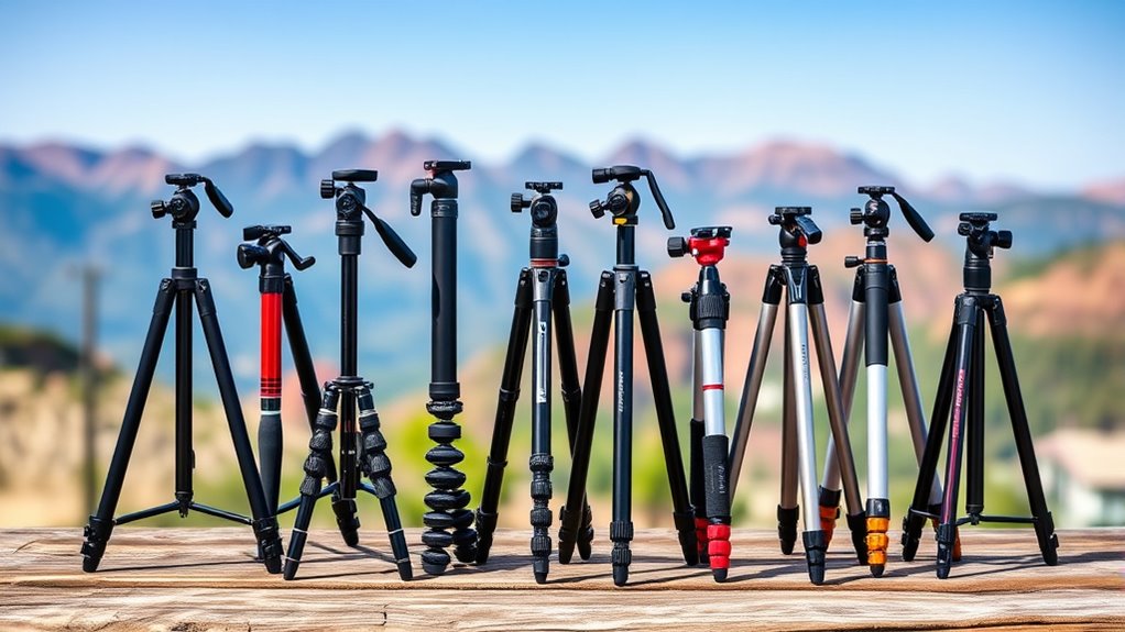 The type of tripod head you pick directly affects how smoothly and accurately you can adjust your camera during shoots. Ball heads offer 360-degree rotation and quick, one-handed adjustments, making them perfect for spontaneous shots and versatile shooting scenarios. Pan-and-tilt heads provide separate controls for horizontal and vertical movements, giving you more precise framing and stability, especially for landscape or architectural photography. Keep in mind, tripod heads vary in weight and size; lightweight models are ideal for travel, but they might compromise stability on uneven terrain or with heavier gear. The right head choice balances ease of use, stability, and portability, ensuring you can make smooth adjustments without sacrificing the tripod’s overall stability during your adventures.