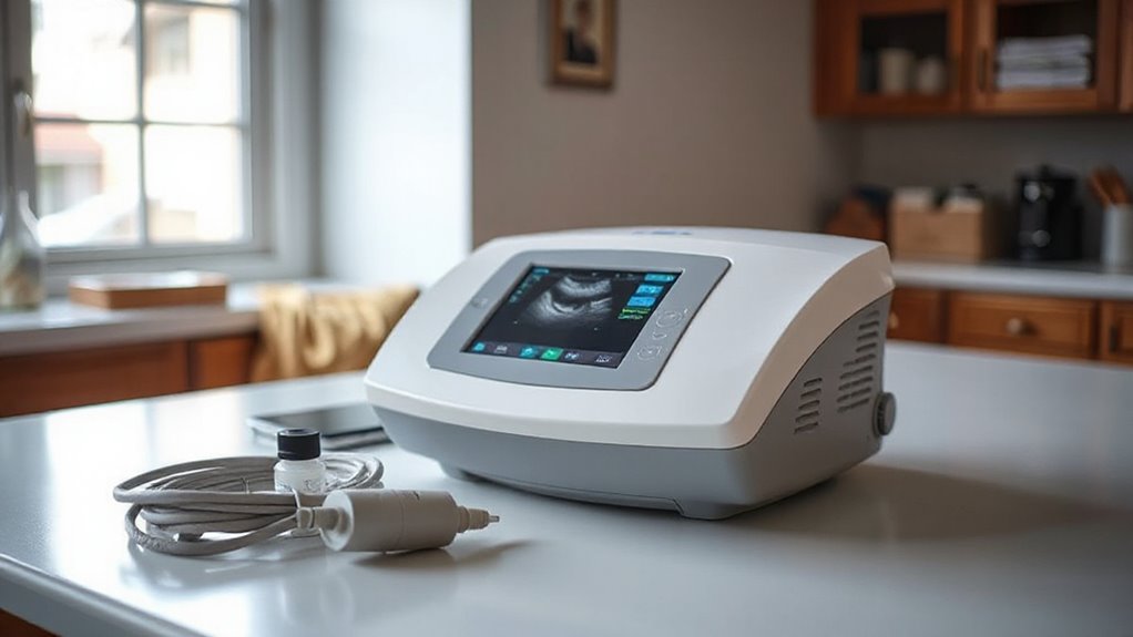 Treatment duration options vary widely among ultrasound therapy machines, and selecting the right one depends on your specific needs. Most models offer sessions from 5 to 20 minutes, giving you flexibility based on your condition. Adjustable timers let you customize therapy, whether you need a quick session for sensitive areas or longer treatments for deeper tissues. Some devices come with preset programs featuring fixed durations, simplifying use, while others provide manual controls for precise timing. Shorter sessions are ideal for initial treatments or delicate areas, reducing discomfort, while longer durations may enhance deep tissue healing. Considering how flexible the treatment times are can help maximize therapy effectiveness and ensure comfort. Choosing a machine with versatile duration options allows you to tailor treatments, making home therapy both efficient and convenient.