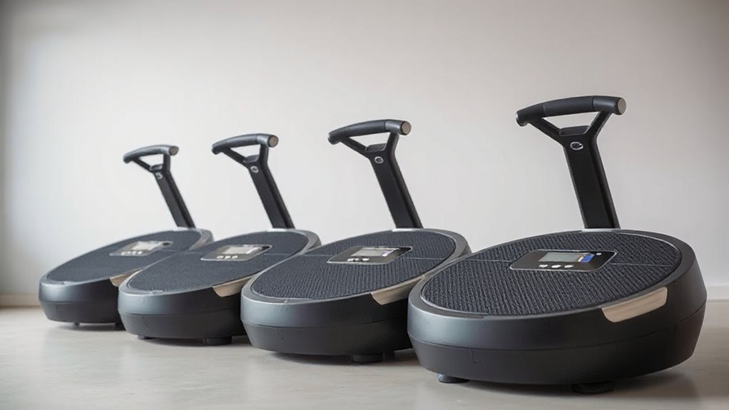 Adjustable handlebars are essential for guaranteeing a comfortable and effective workout on a vibration plate. Most models offer height ranges from about 27 to 43 inches, making it easy to find a position that suits your height. Many vibration plates feature quick-lock mechanisms or simple manual adjustments, so changing the handlebar height is straightforward. Proper adjustability helps maintain good posture and stability, reducing the risk of strain or injury during workouts. These options cater to users of all levels, including beginners, seniors, and advanced athletes, by providing a comfortable grip and support. Some models even include multiple height settings, allowing you to customize your workout to target different muscle groups or routines easily. This flexibility ensures that everyone can find their ideal setup.